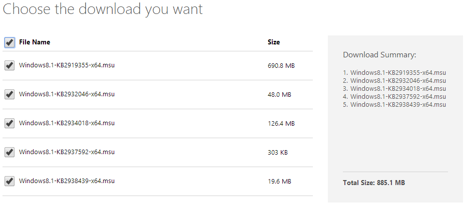 - Manually installed msu in the order above. I had each in Downloads and I simply double clicked to run them. These KB's must be installed in the following order: KB2919442, KB2919355, KB2932046, KB2937592, KB2938439, and KB2934018